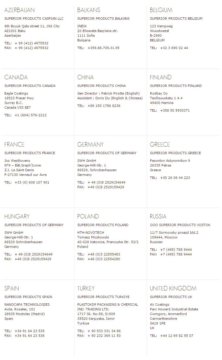 Superior Products Europe έχει ένα πολύ μεγάλο δίκτυο των ενθουσιωδών συνεργατών σε όλη την Ευρώπη και την Αφρική. Οι τοπικές ομάδες μας είναι έτοιμες να σας βοηθήσουν, συνδυάζοντας τις γνώσεις τους με την υποστήριξη από την παγκόσμια ομάδα μας σε θέματα τεχνογνωσίας και εμπειρίας του προϊόντος. Παρακαλούμε μην διστάσετε να επικοινωνήσετε με τον τοπικό συνεργάτη μας απευθείας από την παρακάτω λίστα: